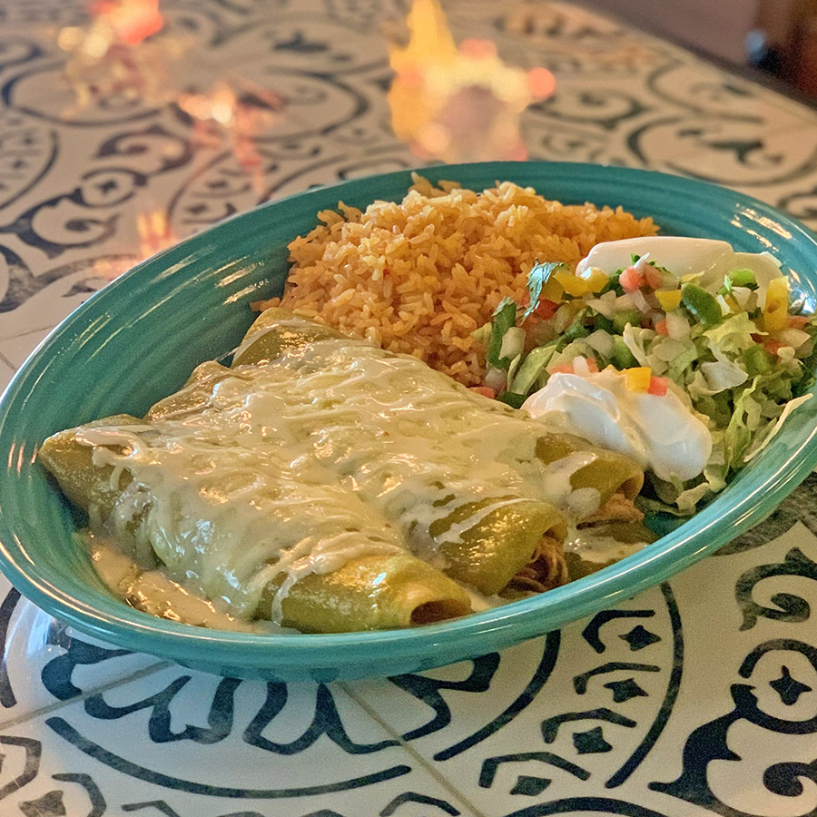 Three rolled corn tortillas filled with shredded chicken and topped with green tomatillo sauce. Served with guacamole, lettuce, and spanish rice.