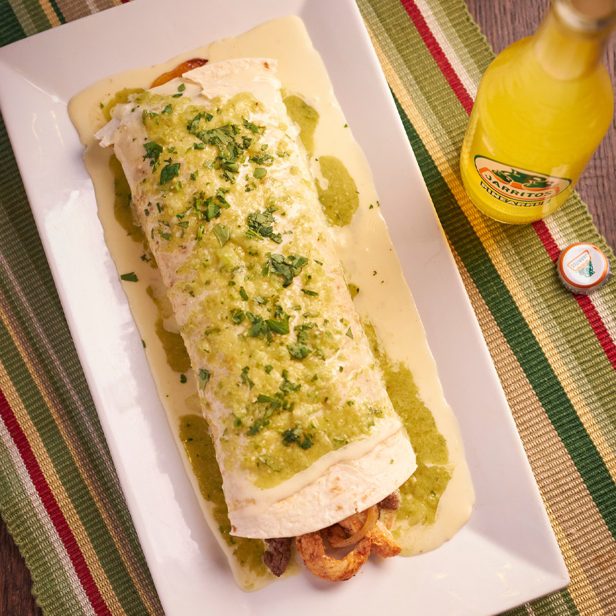 10” tortilla choice grilled chicken, steak, rice, beans, grilled onions, bell pepper, topped with cheese sauce and tomatillo sauce.